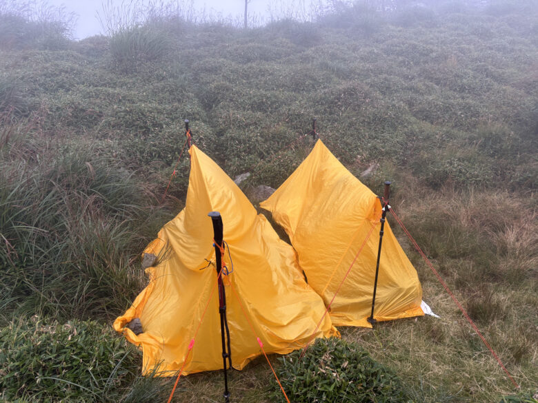 雨風吹く中のツェルト泊でしたが、小屋の中ですし詰め状態よりは大分マシ