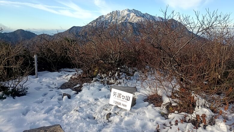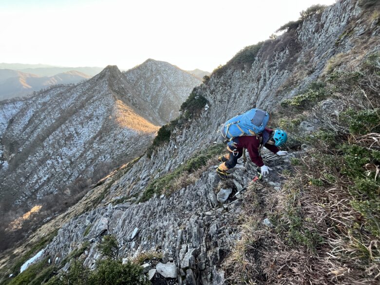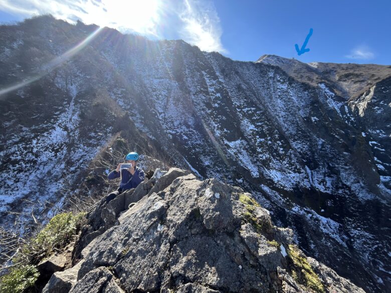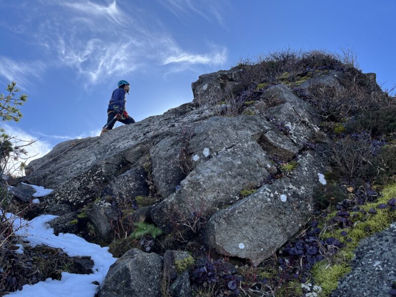 登山道に入ってからの、約20kgの重量は私の歩行速度にブレーキをかけた。1.5kg位を藤本に持ってもらい、なんとか彼女のスピードについていけた。甲ヶ山の直登ルートをゆっくりと登っていく。残雪期のように、積雪はところどころ斜面に残っていた。降雪後は、晴天が続いているせいで、まるで乳牛の斑点模様ではあるがもっと白い部分が多いかな?どんどん高度を稼いでいくが、途中で左に出て行くところを見失いしばらく藪をこぐことになった。雪で足元が滑り悪戦苦闘で、慣れていない藤本は「もー、モー、モォ~!」の連発。聞こえぬふりして黙々と前進し、何とか軌道修正し登山道に合流したところでへたり込む。倍近いコースタイムとなり、体力も消耗した。ここからは、文字通りの牛歩となった。牛ヶ山ではなく、甲ヶ山の頂上を目指し岩稜帯を越えていく。シートベントで簡易ハーネスを作りいざという時に備える。2箇所、岩を這い上がるところでスリング確保する。山頂へ到着。