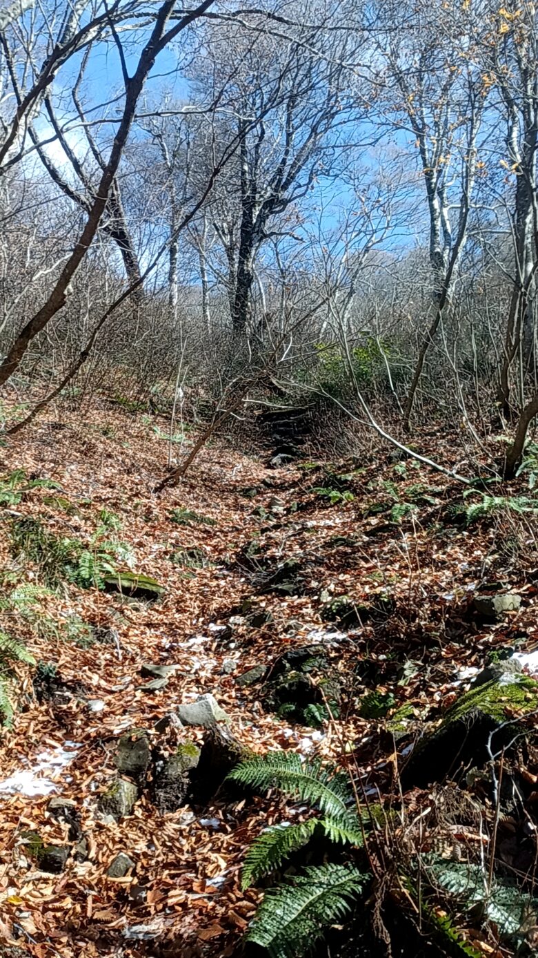 最高のビバーク地を後にし、矢筈ヶ山へ向かう。矢筈ヶ山の下りは、少し緊張する場所があったが、甲ヶ山の下りと比べるとなんてことはない。あっという間に大休峠避難小屋に着いた。計画ではここが宿泊予定地だったのだが…。環境に配慮して、我慢していたトイレに行くも我慢し過ぎで、私のお腹は張っているのにほとんど出てくれない。最悪の状態で野田ヶ山へ向かう。お腹の不調が原因かどうかはわからないが、またもや私の歩行速度にブレーキがかかった。藤本についていけない。あきらかにこのペースだと日没までに予定のコースで下山することは無理と判断し、予定を変更する。留守宅本部へ下山時刻が遅れることと、その旨をショートメールで連絡を入れた。