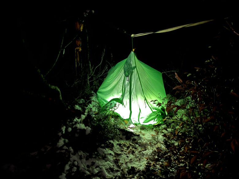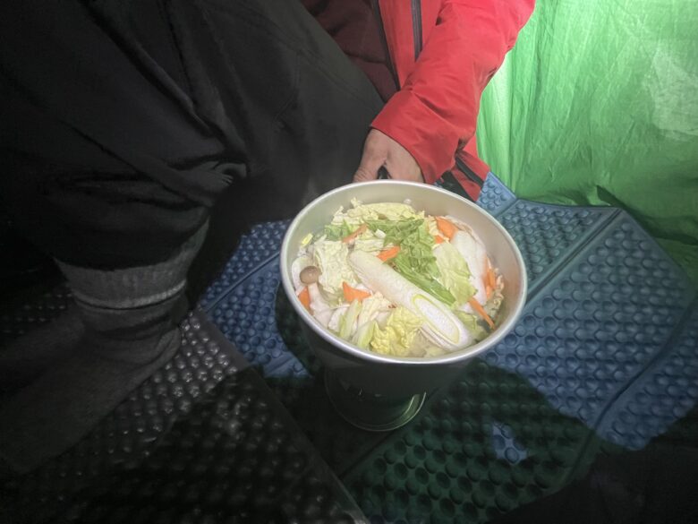ここで、アイゼン、ピッケルとハーネスに装備を切り替え、慎重に甲ヶ山の長い下りを、まるでアイゼントレーニング実践で下降していく。重量が肩に食い込むのと、バランスを取るのに苦労しながら緊張が続く。下降ルート上には、ほとんど着雪は無かったが、途中でのアイゼン装着は不可能と判断した。懸垂下降の方が安全、且つ早かったかもしれなかった。日没が近くなって来ているが、あせらずゆっくりと確実に行動した。トラバースにかかり、なだらかな尾根とようやく合流した。弓ヶ浜の地平線は、すっかり夕焼けで赤く染まっている。体力、気力も限界。ここをビバーク地とする。満天の星空で最高の夜を過ごせた。思ったより風もなく、ツエルトも寒さを感じさせなかった。赤ワインで労をねぎらう。熱々の鍋に肉たっぷりで、しめは「サトウのごはん」で雑炊。最高のメニューで体力を回復させ就寝する。