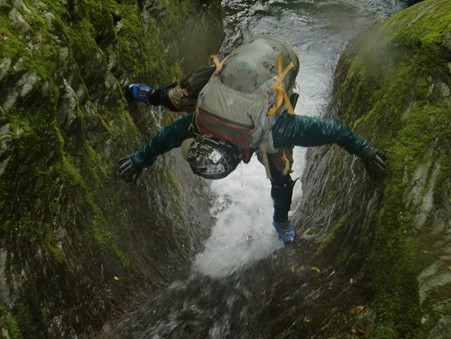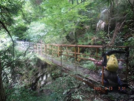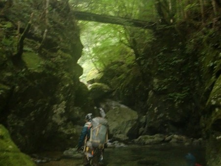 橋に差し掛かり、蜂に注意し一人一人ゆっくり橋を渡るが、メンバーの一人が刺された。素早くポイズンリムーバーで吸い出すと、透明な液が出てそれから血に変わった。ショック状態には至らない様子なので、先に進む事に、橋の少し先で入渓