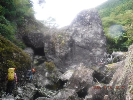 ここで地元Sさんの的確な提案で、無理せず十字分岐近くで出渓する。