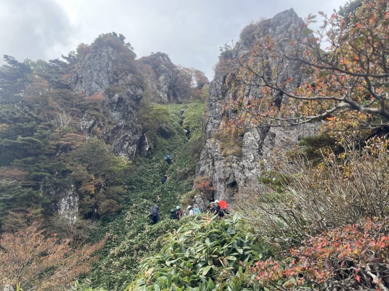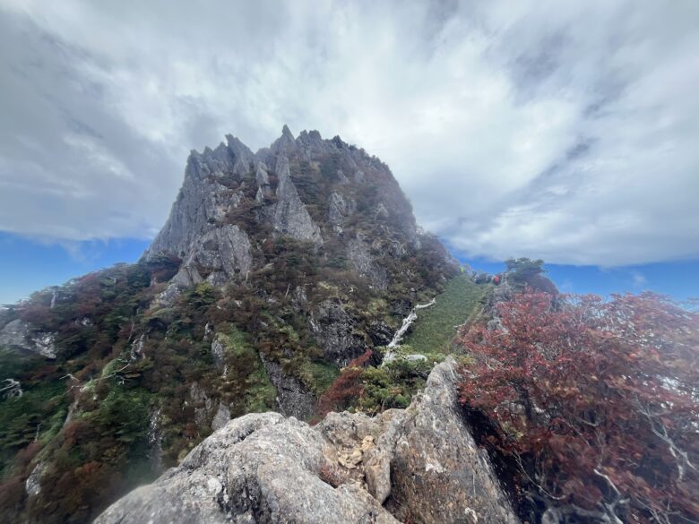 面河本谷中沢から突き上げたコルからの南尖峰は圧巻だ。紅葉を楽しみながら、天狗岳へ到着する。記念写真を撮って弥山へ。弥山はさらに登山者で満杯。登頂記念に名物?の「天狗カレー&シチュー」を食し早々に下山開始した。