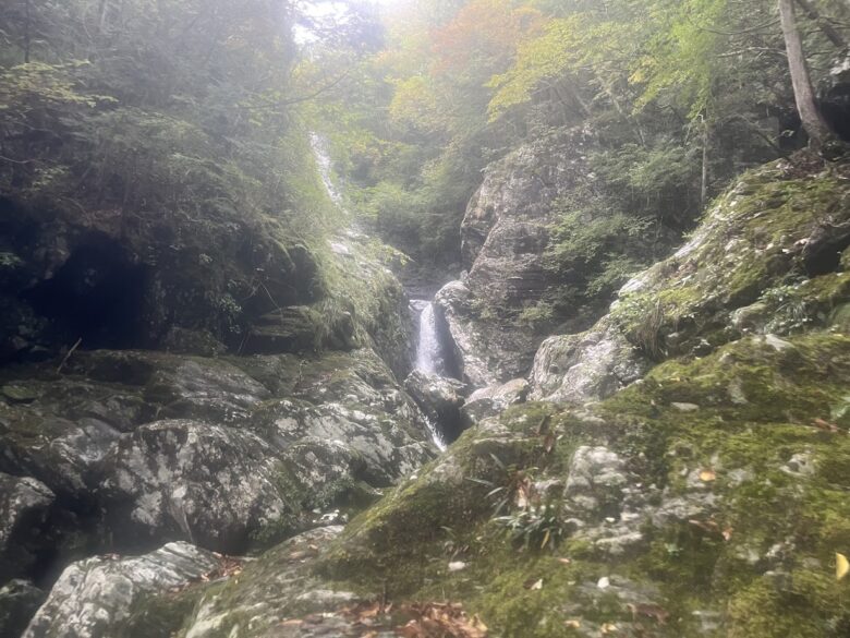 気温約18℃の中、しっかり着込んで入渓する。登山口からいきなり沢に入るので体がまだ温まっていない。苔むした滑りやすい谷で薄暗いが水はきれい。いきなり4段15mの滝が美しく出迎えてくれたが、さすがにシャワークライミングはする気にはなれないので左岸を巻くことにした。50mもある八間滝が姿を見せる。下部はやさしそうだが、上部は難しいようだ。右岸を高巻くが、この高巻きも難しいらしく、ロープを出して通過している記録もあるので、慎重に高巻き、無事に滝の落ち口に降り立った。この後も滝の連続で突破できそうなところもあるが、時間も考慮し高巻きが主体となった。4m滝の裏側を右から左にトラバースして越えていくところが面白かったが、ワンポイント緊張するところがあった。